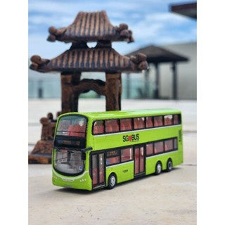 Introducing the double decker lime green bus, a replica of the Volvo model that is sure to impress. This brand new model is designed in Singapore and is not on mass production, making it a pretty unique model. The bus is 1:110 in size, with dimensions of 10cm/2cm, and is made from metal with an inside plastic frame.